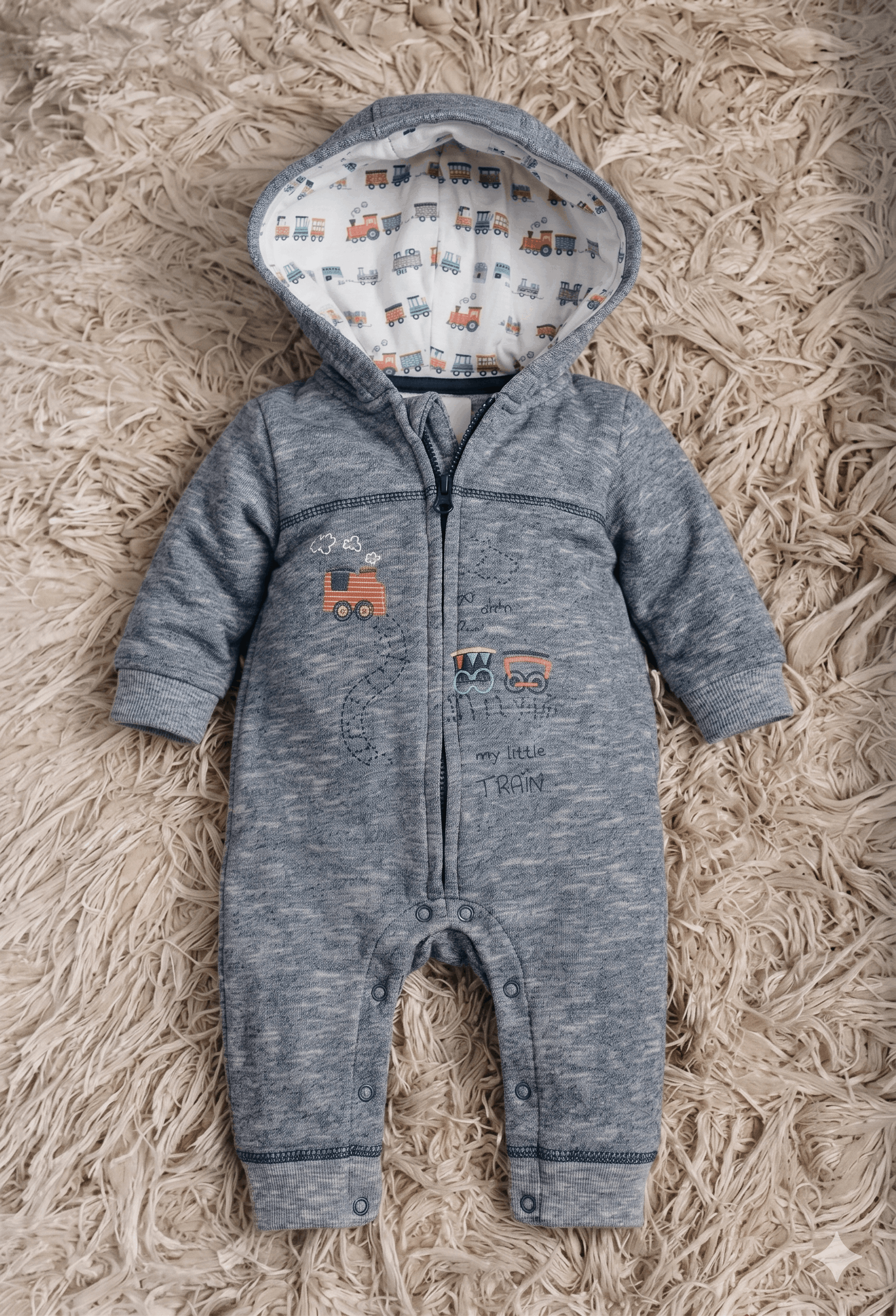 Uroku dodaje mu starannie wykonany motyw pociągu z napisem "My Little Train" oraz kontrastowa podszewka kaptura w wesołe lokomotywy. Praktyczny suwak na całej długości ułatwia szybkie przebieranie, a ozdobne przeszycia na kolanach nadają ubranku nowoczesnego, sportowego charakteru. To ubranko, które zachwyca detalami i gwarantuje najwyższy komfort każdego dnia.